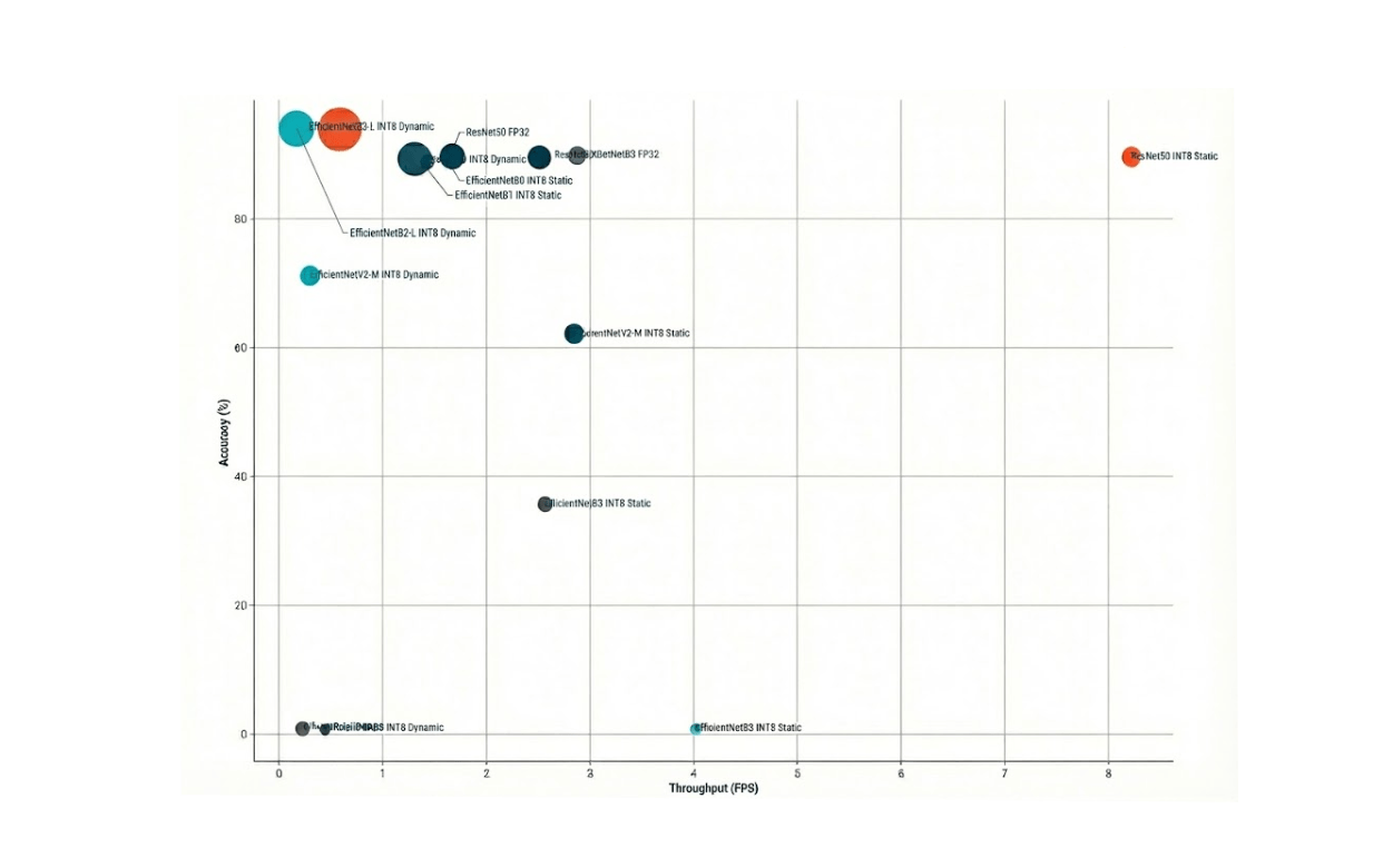 - Advanced Optimization with Quantization-Aware Training (QAT): For models that show accuracy degradation with Post-Training Quantization (such as the EfficientNet family), QAT is the next logical step. By introducing the simulation of quantization effects during the training process itself, QAT can often produce an INT8 model with virtually no accuracy loss, potentially making these highly efficient architectures viable for production.