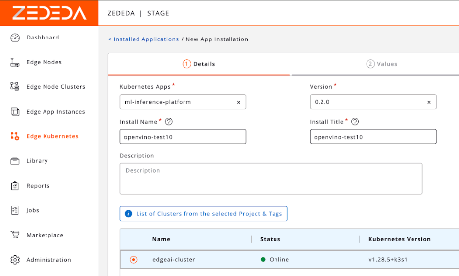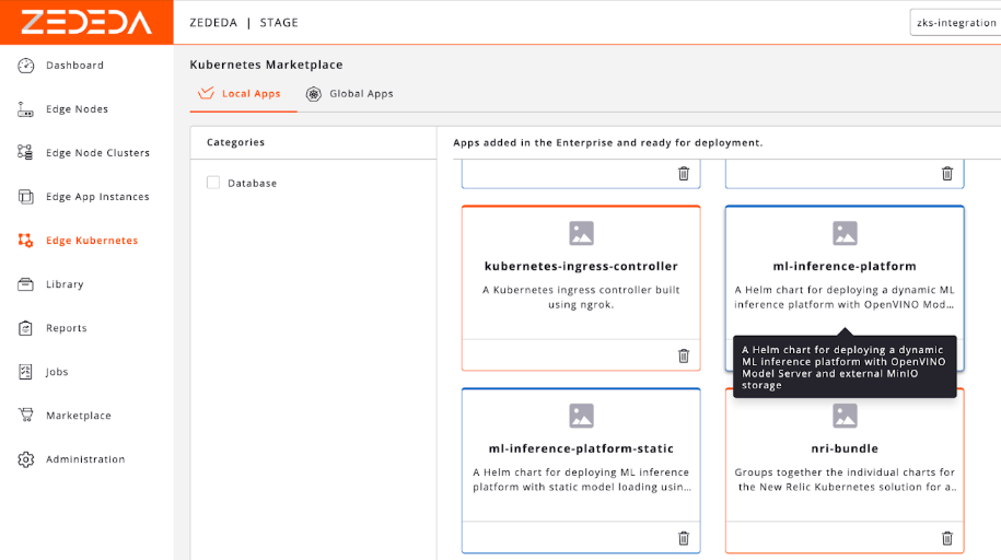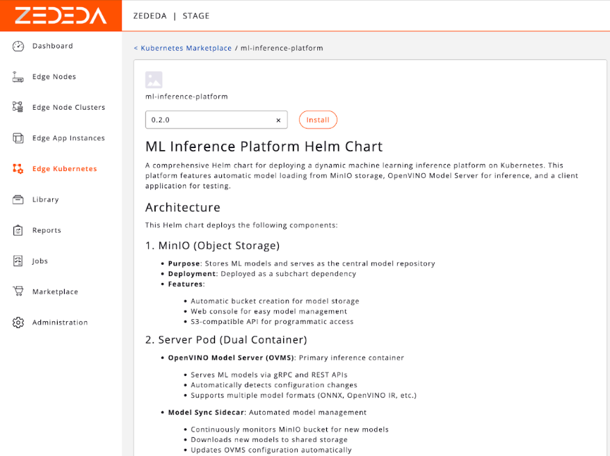 First, we upload our container images and Helm chart to ZEDEDA’s cloud-based controller. Then we define a “Project” and specify which device group (e.g., “all-california-stores,” “factory-floor-line-1”) should run this application. Once we’ve uploaded it, we should see it in our ZEDEDA Kubernetes Marketplace; the screenshot below shows one such chart called ml-inference-platform.