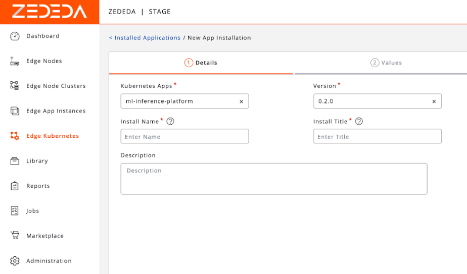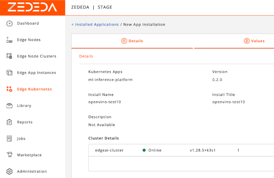 With our application packaged as a containerized, Helm-defined workload, the ZEDEDA platform takes over to handle the unique complexities of edge orchestration. ZEDEDA is the control plane that bridges our application to the distributed fleet of physical edge devices. To do this, we use ZEDEDA Edge Kubernetes App Flows, documented here, to deploy our applications and models to our edge devices.